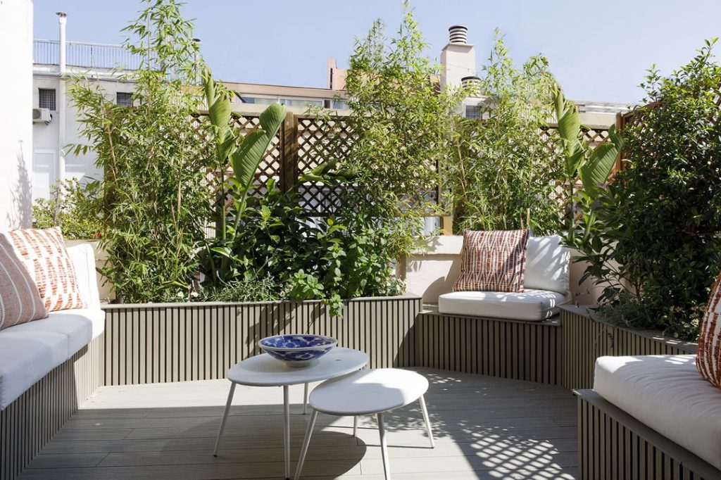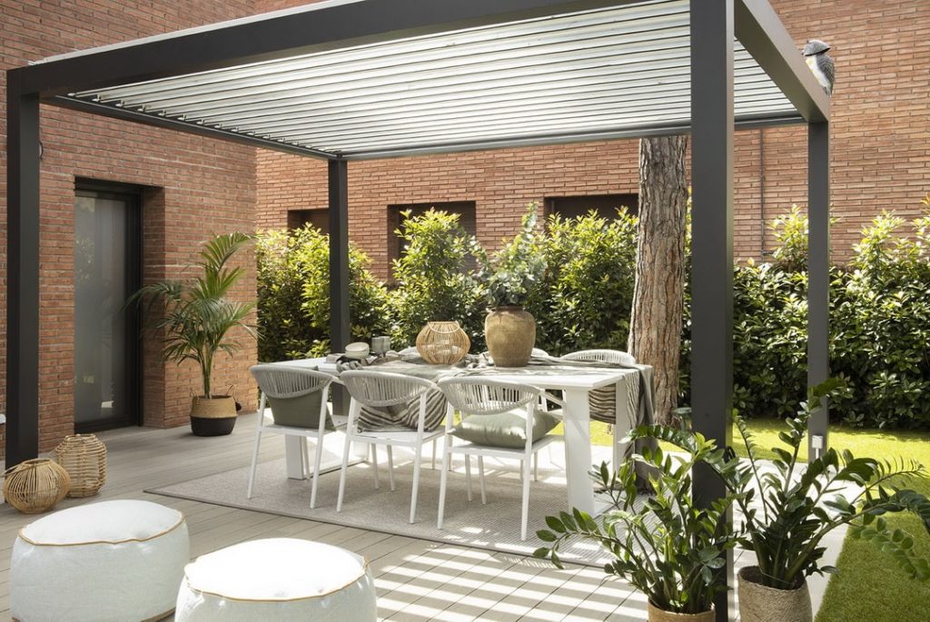 Considera también la posibilidad de utilizar pérgolas con enredaderas para añadir un toque natural y fresco a tu terraza.